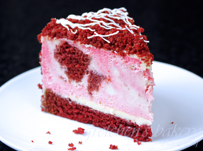 Due to the reaction from the cocoa powder with the baking soda, the cake took on a slight red color upon baking.
